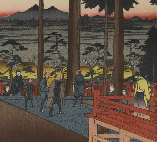 Devant le sanctuaire se profilent des toits de chaume, probablement ceux de maisons de thé, et derrière ces toits, des pruniers en fleurs, petit détail qui a son importance, car si nous avions jusqu’ici compris d’où l’estampe a été peinte, nous allons maintenant savoir à peu près quand elle l’a été : pendant le matsuri du sanctuaire, qui a lieu le jour du premier cheval du mois (hatsu-uma 初午) de février (le cheval du zodiaque chinois) dans l’ancien calendrier lunaire (旧暦), que l’on utilisait encore à l’époque de Hiroshige2. Pourquoi cette date ? Parce que ce serait ce jour-là qu’autrefois, selon la légende, la divinité Inari serait descendue sur le mont Inari.