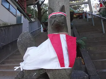 Environ le tiers des sanctuaires shintō sont dédiés à la divinité Inari. Quand vous roulez ou marchez au Japon, ces sanctuaires sont faciles à reconnaître par la présence de statues de renard devant ou dans l’enceinte. Celui-ci ↓, quand nos amis de Geo Pottering sont allés au sanctuaire ce jour-là, semblait porter ses vêtements des grandes occasions…