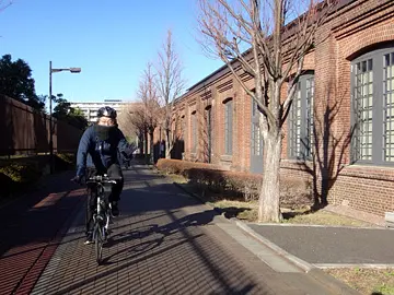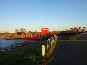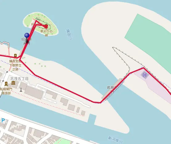 Le trajet passe sur l’ancienne écluse Iwabuchi, dite « l’écluse rouge ». Construite de 1916 à 1924, elle a été repeinte en rouge en 1955. On peut y rouler à vélo pour aller sur la petite île et son Parc de l’écluse (水門公園), puis revenir sur la piste cyclable, qui passe sur la nouvelle écluse (dite l’écluse bleue).