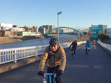 Sur la carte, la balade continue ensuite vers la gauche, jusqu’à la limite ouest de l’arrondissement, puis bifurque presque plein nord jusqu’à la rivière Shingashigawa. Nous roulons un moment dans l’arrondissement d’Itabashi (板橋区), car la limite avec celui de Kita se trouve au beau milieu de la rivière. Puis nous empruntons un pont réservé aux piétons et cyclistes (歩行者自転車専用橋) pour revenir dans Kita et y rouler jusqu’au parc Ukima (浮間公園).