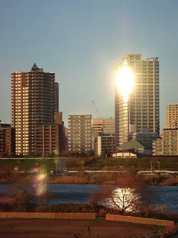 Sous un soleil déclinant, nos amis cyclistes ont pris une photo des lieux depuis le Nouveau grand pont Arakawa (Shin-Arakawa-Ōhashi 新荒川大橋). On peut y reconnaître, sur l’autre rive, le temple Zenkōji sous son apparence actuelle… et la luxuriante forêt d’immeubles élevés qui l’entoure.
