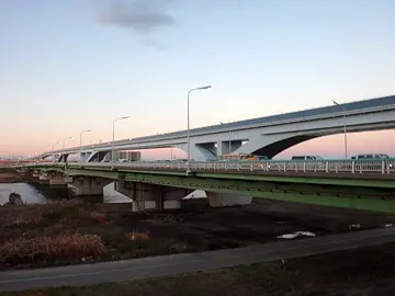 Le Grand pont Ōgi, dominé par le Grand pont Goshiki Zakura (五色桜大橋) de la Route circulaire centrale métropolitaine (首都高速中央環状線).
