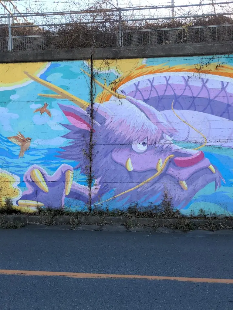 2024 est l’année du dragon. Nous en avons aperçu un beau près de la gare de Toride, le long d’un gros mur qui longe la voie ferrée. Il avait l’air gentil, à en juger par ses yeux, la petite fille qui marche dessus et les oiseaux qui virevoltent autour.