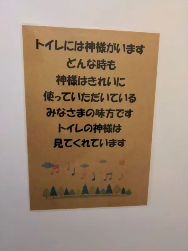 Dans la balade hivernale qui nous intéresse ici, roulée le 6 janvier, cette section filmée se termine à l’hôtel Shokoron, ce que nous n’avions pas du tout prévu initialement (nous ignorions même jusqu’à son existence… il nous a accroché l’œil au passage). Il s’y trouve un petit coin aménagé pour les cyclistes, et dans les toilettes (du petit coin, pour ainsi dire) une affiche explique qu’il existe une divinité des toilettes et qu’elle veille sur ceux qui gardent les lieux propres… tout comme dans la chanson qui dit que pour devenir une jolie femme comme la divinité des toilettes, il faut les garder propres.