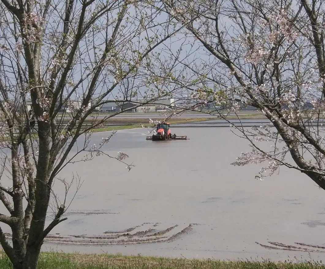 Un peu plus tôt en avril 2022, alors qu’il ne restait plus que quelques fleurs sur les cerisiers, cet exploitant préparait le sol pour le repiquage. La mince couche d’eau va protéger les jeunes plants repiqués contre les variations extrêmes de température et rendre la vie difficile aux mauvaises herbes, dont les graines apportées par le vent flotteront au lieu de prendre racine.