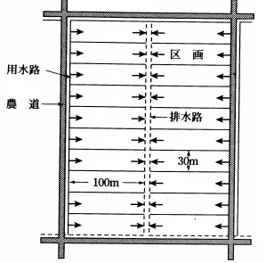 Parcelles de 30 m x 100 m entourées d’un chemin, avec, sur la face de 30 mètres, le canal d’irrigation du côté du chemin et le canal d’évacuation du côté opposé. (Source)