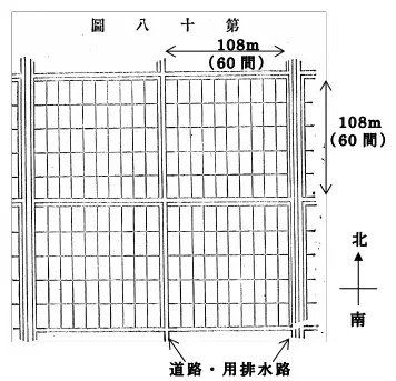 Ces 108 mètres viennent de l’unité de mesure 間 (ken), que nous avons rencontrée dans un billet en 2022 (Ne jetez pas les couches jetables !). 1 ken, soit la largeur d’une étroite route rurale traditionnelle, correspond à 1,8 mètre. Un carré de 60 ken x 60 ken correspond donc à 108 m x 108 m. Le tout est orienté nord-sud, peu importe la topographie environnante, formé de 50 parcelles rectangulaires (5 rangées de 10), entouré de canaux qui servent indistinctement à l’irrigation de la rizière et à l’évacuation des eaux, et ces canaux sont eux-mêmes entourés de chemins.