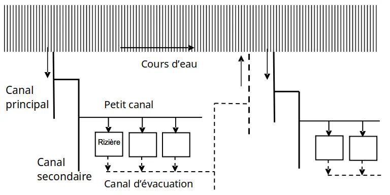 Toujours sur le même schéma, on peut voir que le canal ( 水路 ) a été remplacé par un canal d’irrigation ( 用水路 ), qui transporte l’eau d’un cours d’eau ou d’une étendue d’eau jusqu’à la rizière, et par un canal d’évacuation de l’eau ( 排水路 ). Schématisons encore un peu plus :
