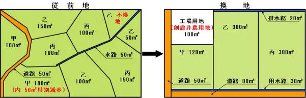 Ce schéma montre, à gauche, une répartition traditionnelle des terres cultivées, où celles des ménages agricoles X, Y et Z sont dispersées et de formes diverses. Un canal ( 水路 ) passe à travers, ainsi qu’une petite route sinueuse. À droite, en opposition à ces terres traditionnelles ( 従前地 ), le schéma montre des terres échangées ( 換地 ) entre les ménages X, Y et Z membres de l’entité de gestion collective, réorganisées en quadrilatères, entourées de canaux d’irrigation rectilignes et de chemins plus larges (de 50m², la surface routière est passée à 130 m² sur le schéma), également rectilignes, et dotées d’un terrain pour l’aménagement d’une usine où se trouvent les équipements agricoles collectifs.