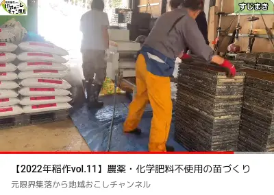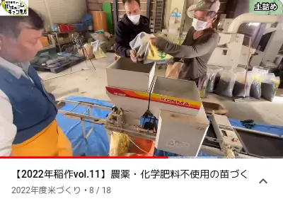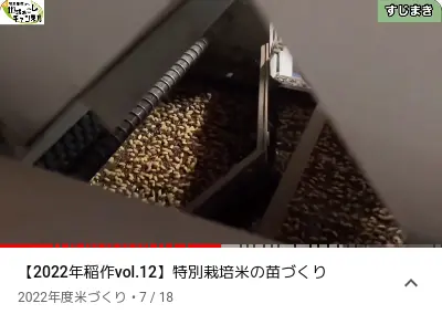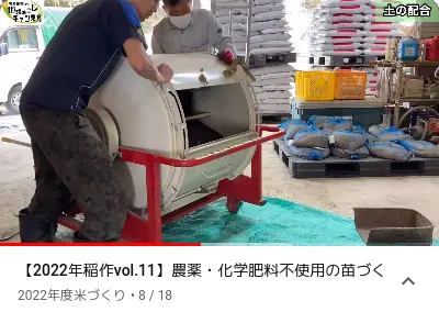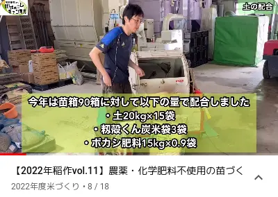 Dans les toutes premières secondes du clip qui suit, on voit deux photos : à gauche, une butte de balle de riz ( 籾殻 ) avec un tuyau, et à droite, la butte une fois transformée en charbon. Dans sa vidéo, l’exploitant prépare un mélange de terre ( 土の配合 ) pour remplir 90 bacs de semis, au moyen de 3 sacs de charbon de balle de riz qu’il a préparés l’automne précédent, de 15 sacs de 20 kg de terre et de 0,9 sac de 15 kg d’engrais naturel bokashi. L’engrais bokashi est composé de son de riz ( 米ぬか ) et autres matières organiques.