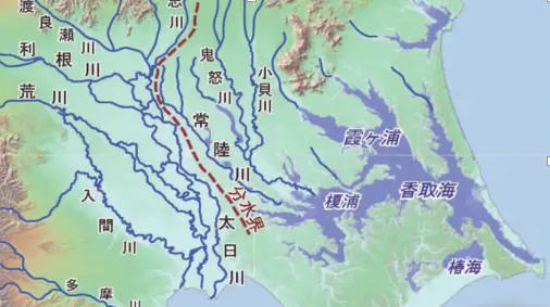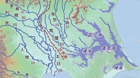 Comme l’expliquent les chercheurs Tomio INAZAKI, Yoko OTA et Shigenori MARUYAMA dans un très bel article publié en 2014 dans la revue académique 地学雑誌 (Journal de géographie, numéro 123 (4), la plaine du Kantō se compose principalement de terrasses incisées par des fleuves et rivières, et de basses terres (plaines alluviales) engendrées ici et là par le lit instable et capricieux de ces cours d’eau. Or, pour rendre la plaine cultivable, il est indispensable d’irriguer les terrasses et de draîner l’eau des basses terres. Les auteurs ajoutent à cela un autre problème : la plaine se termine, à l’est, aux environs de Chōshi (銚子), par une zone surélevée (celle de la paume sur la main de mon bipède), jouxtée, du côté ouest , d’une zone de sédimentation qui, à l’époque d’Ieyasu, se trouve en grande partie submergée par des bras de mer.