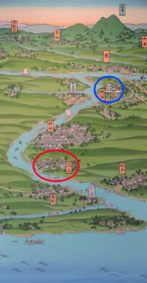En bleu, le musée du château à la jonction des fleuves, et en rouge, Nagareyama. Aujourd’hui, des pistes cyclables longent les deux rives des deux fleuves.