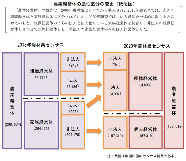 Sur ce schéma qui compare les termes des recensements de 2015 et 2020, et où il faut regarder les moitiés de droite et de gauche, comme qui dirait… « en miroir », on voit que la réorganisation de la terminologie peut avoir un impact sur les chiffres obtenus dans le dénombrement des entités de gestion agricoles ( 農業経営体 , aux extrémités gauche (2015) et droite (2020) du schéma).