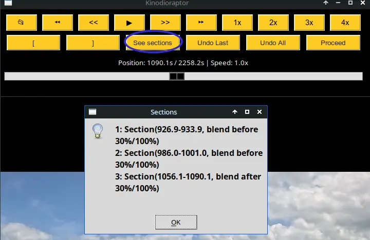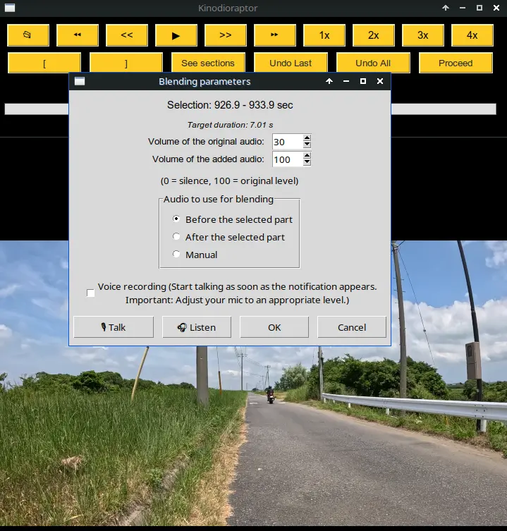 Sur cet exemple, je réduis à 30% le son de la section originale, et lui superpose le son des 7 secondes qui précèdent (ou, si ce son ne me convient pas pour une raison quelconque, le son des 7 secondes qui suivent le passage de la moto). Tout en bas de cette fenêtre de paramètres de mixage, il y a un bouton d’écoute ([Listen]). Quand on clique dessus, Kinodioraptor prépare un échantillon audio de la nouvelle section de 7 secondes, sur laquelle, comme par magie, le motard remplace son affreux moteur à combustion par un agréable moteur électrique dont le niveau de doux ronronnement dépend simplement du volume choisi (30 sur cet exemple). Pour une balade très zen, on couperait complètement le bruit du moteur en choisissant 0 (zéro) pour l’audio original, mais dans le cas d’une vidéo conçue pour Kinomap, où le réalisme et l’expérience immersive passent avant tout, 30 est généralement un bon choix.