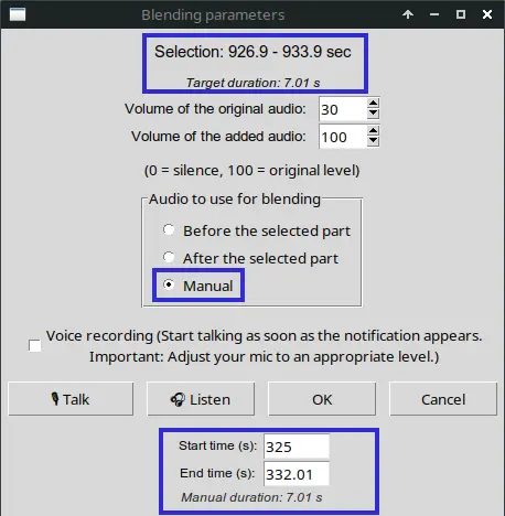 L’option de paramétrage manuel permet de spécifier le début et la fin de la partie audio à utiliser pour le mixage. Ici, j’utilise le son qui commence à la 325e seconde de la vidéo pour atténuer celui de la moto indésirable (926,9 à 933,9).