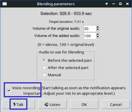 J’ai aussi prévu une autre option, à utiliser avec parcimonie, qui permet de commenter la vidéo avec le microphone de l’ordinateur. C’est le bouton [Talk], qu’on peut utiliser après avoir coché « Voice recording ».
