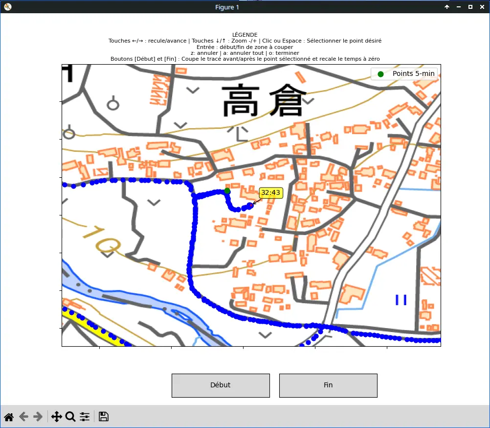 Je me retrouve dans une interface qui fonctionne exactement comme je voulais pour manipuler mon tracé, comme l’indique la légende tout en haut : déplacements sur la carte à l’aide de la souris et des touches de clavier, zoom -+ avec le clavier, indication des intervalles de 5 minutes sur la carte pour faciliter les grands sauts temporels avec la souris, et deux boutons (en bas) pour spécifier les points de début et de fin de la partie de la balade qu’il est prévu de mettre sur Kinomap. Avec ça, j’ai tout ce qu’il faut pour manipuler le fichier, sans fonctions ni menu inutiles.