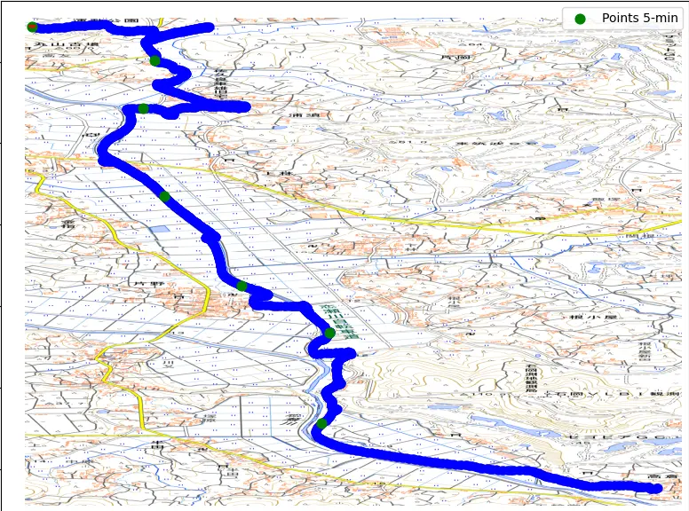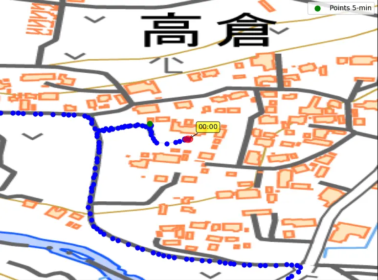 Une fois les tuiles téléchargées, le fichier est épuré pour enlever tous les doublons (points de latitude et longitude identiques sur la carte), histoire d’alléger le fichier, puis le tracé s’affiche, comme ceci. Point important, le fichier est modifié pour commencer à 00:00:00, quelle que soit l’heure de la journée à laquelle j’ai commencé à rouler.