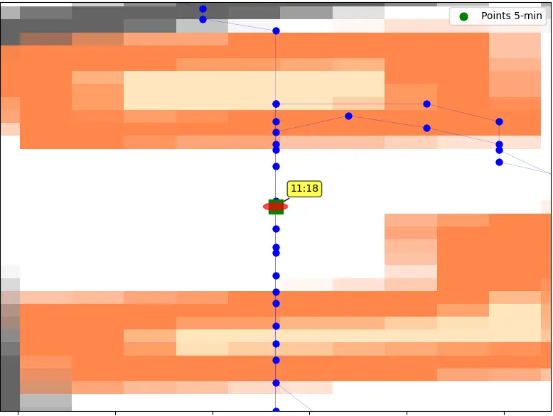 Carré vert du bas : 11:18, délimitateur de la section à couper. Point juste au-dessus : 13:06. Point suivant : 11:19, qui va être éliminé, ainsi que tous les autres, jusqu’à 13:06. Carré vert du haut : Point 13:07, qui va devenir 11:19.