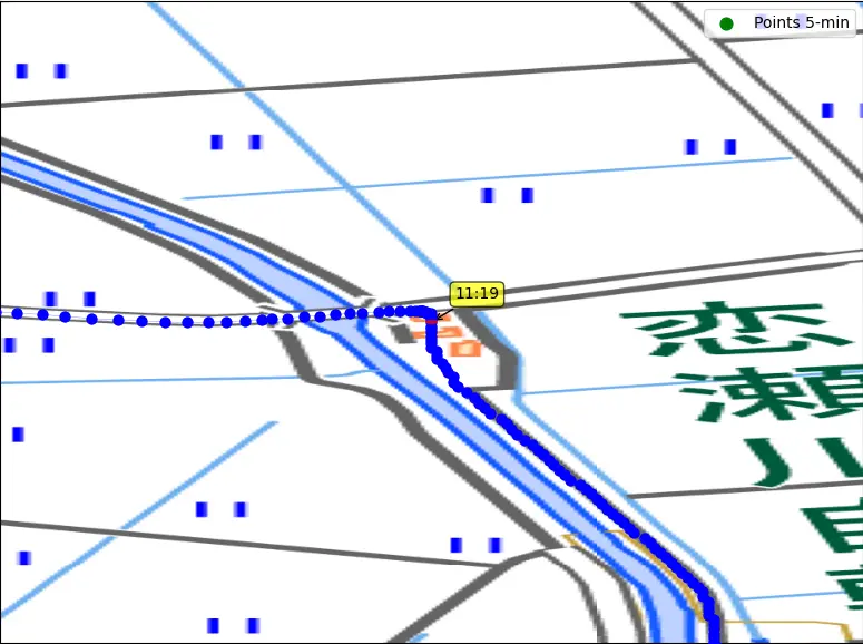 Voilà, à 34:52 (nouveau temps, pas celui du gros tracé initial), je suis arrivé dans un cul-de-sac et j’ai arrêté de filmer. Je suis ensuite revenu sur mes pas pour faire une pause dans le parc, ce qui explique les trois points verts (intervalles de 5 minutes pendant lesquels je marchais dans le parc).