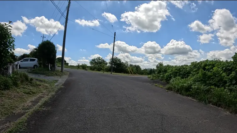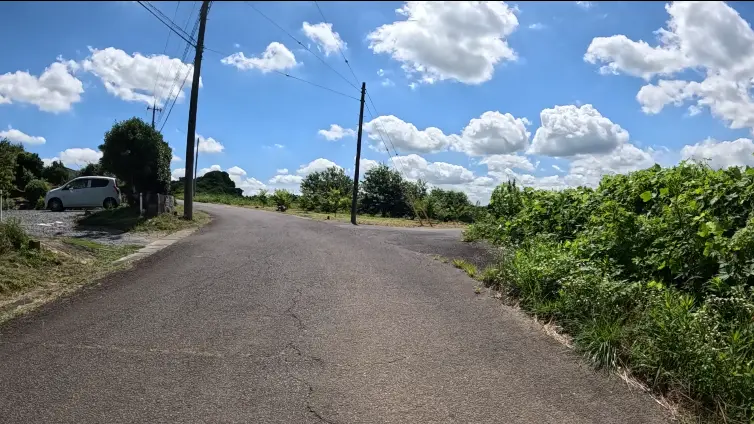 Une minute plus tôt, j’aurais dû tourner à droite, juste avant le poteau de droite, mais j’ai pris à gauche. Je suis donc revenu, et me voici de nouveau devant le point où je vais prendre à droite cette fois-ci. Sur la route, juste devant moi, il y a une longue fissure qui divise la chaussée au centre, et, sur sa gauche, une fissure perpendiculaire qui occupe la moitié du chemin. L’image que vous voyez est celle d’une image-clé. Je peux parfaitement couper ici et j’obtiens un fichier vidéo qui commencera exactement là à la lecture. Donc jusqu’ici, pas de problème.