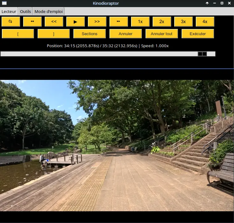 Faisons un essai. Je vais d’abord me déplacer à l’endroit où je veux terminer la découpe, et choisir l’image-clé la plus proche de l’endroit où je veux découper (concrètement, c’est la première capture d’écran que j’ai mise ci-haut). Kinodioraptor va alors mettre ce bout (de la position de fin de coupure à la fin de la vidéo) dans un fichier temporaire et le garder en réserve pour la concaténation, quand il collera le bout qui suit la coupure au bout qui la précède.