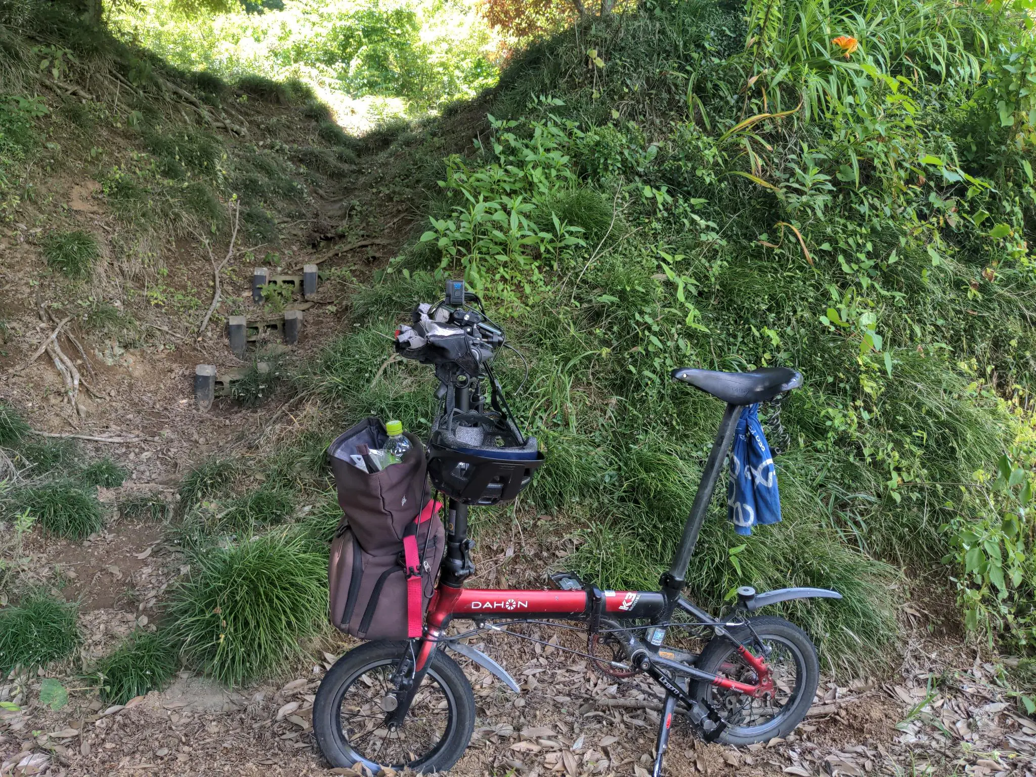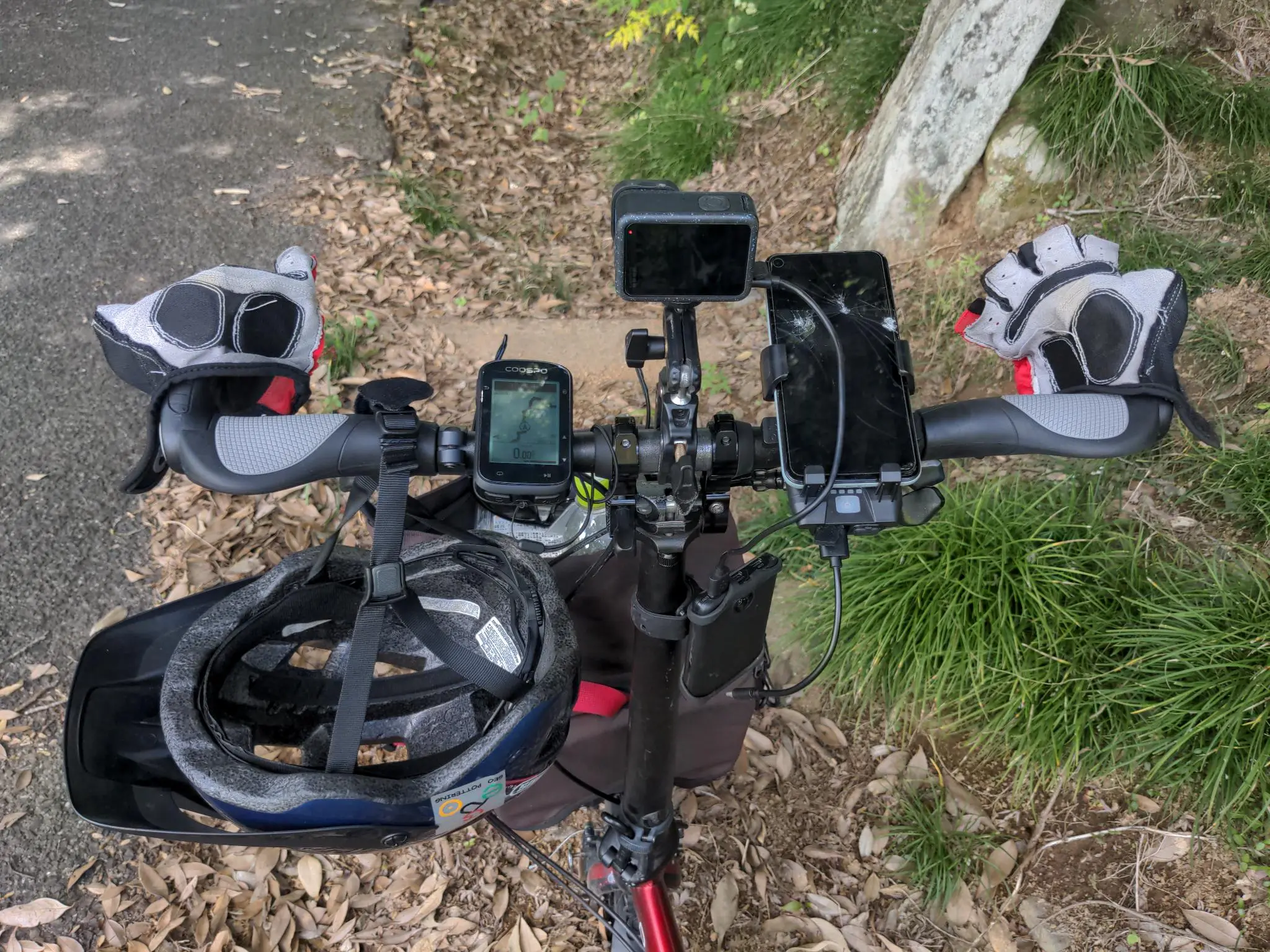 Toujours moi, avec le GPS, la GoPro, le vieux téléphone cassé pour afficher la carte du tracé sur OsmAnd, et une batterie pour alimenter tout ça. Au besoin, la lampe qui sert de support au téléphone peut aussi servir de batterie pour l’alimenter. Le fil qui sort de la GoPro et passe devant l’écran du téléphone est une erreur typique de mon bipède, qui réfléchit toujours après-coup. Je lui ai fait corriger ça dans la balade suivante.