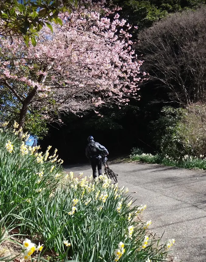 Il croyait pouvoir attaquer l’Everest avec son nouveau vélo… Une douce pente sous les cerisiers lui a prouvé le contraire, sous le regard amusé des narcisses.