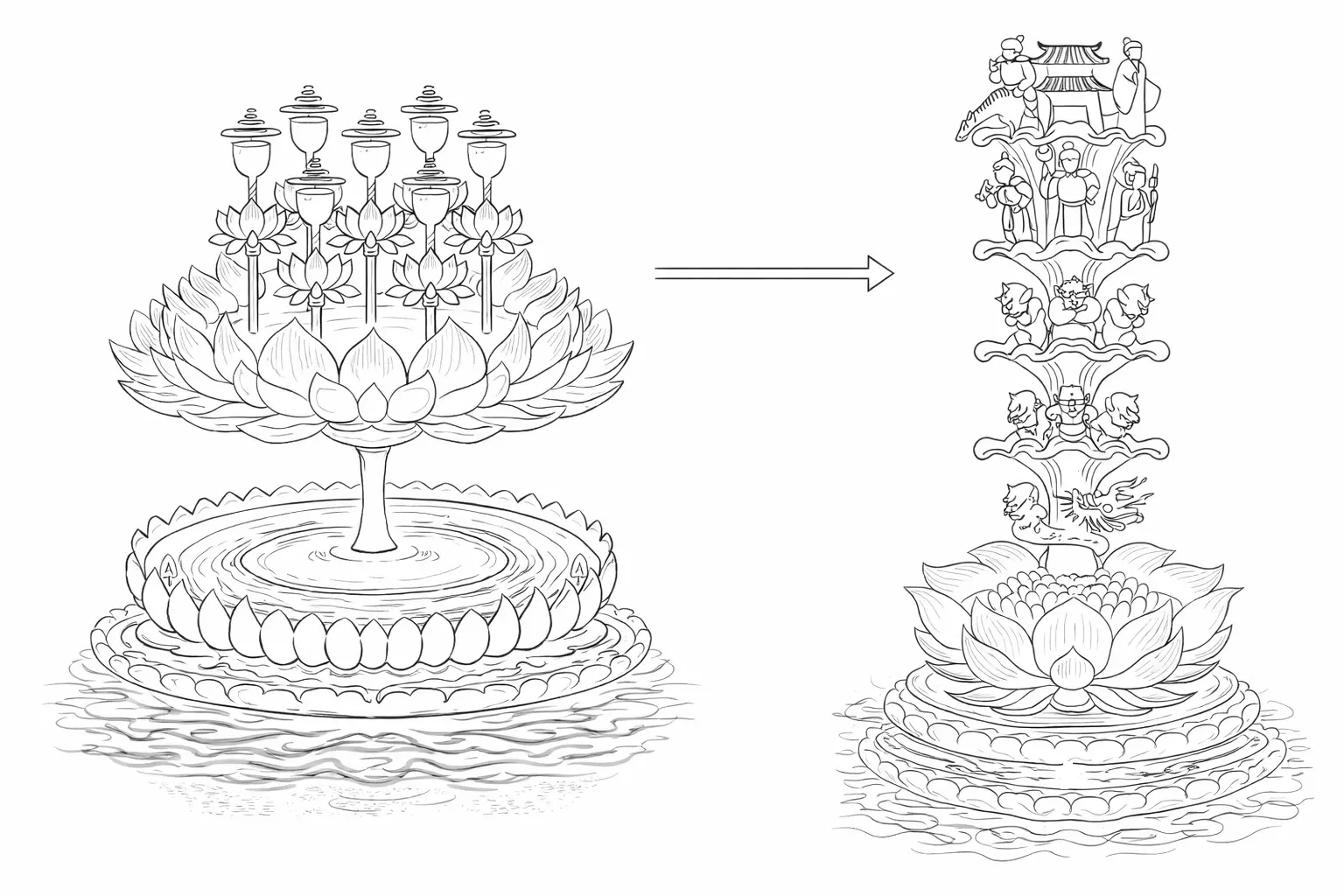 Dans le livre et sur Internet, on peut trouver quelques représentations schématiques de cette cosmologie du lotus. J’ai en montré une à une IA quelconque pour qu’elle m’en dessine une version noir et blanc pour le blog.
