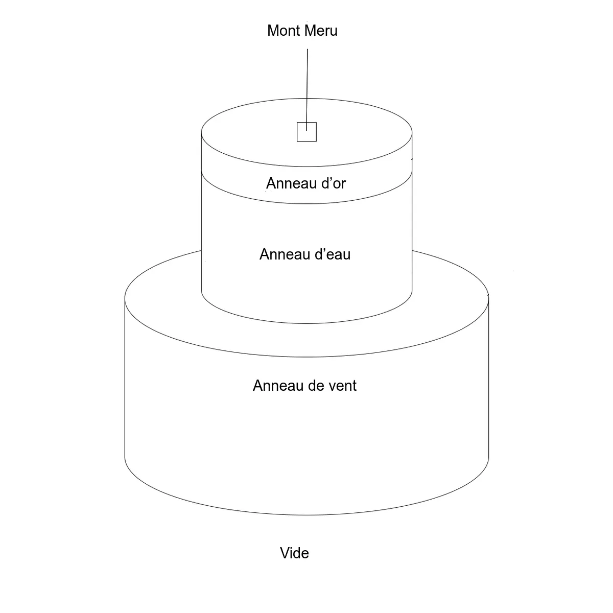 Un anneau de vent, d’une circonférence de 1059 et d’une hauteur de 1,6 million de yojun, flotte dans le vide. Un étage plus haut se trouve l’anneau d’eau, avec un diamètre de 1 203 450 yojun et une hauteur de 800 000 yojun. Au-dessus de lui, occupant un même diamètre, s’étend l’anneau d’or, haut de 320 000 yojun.
