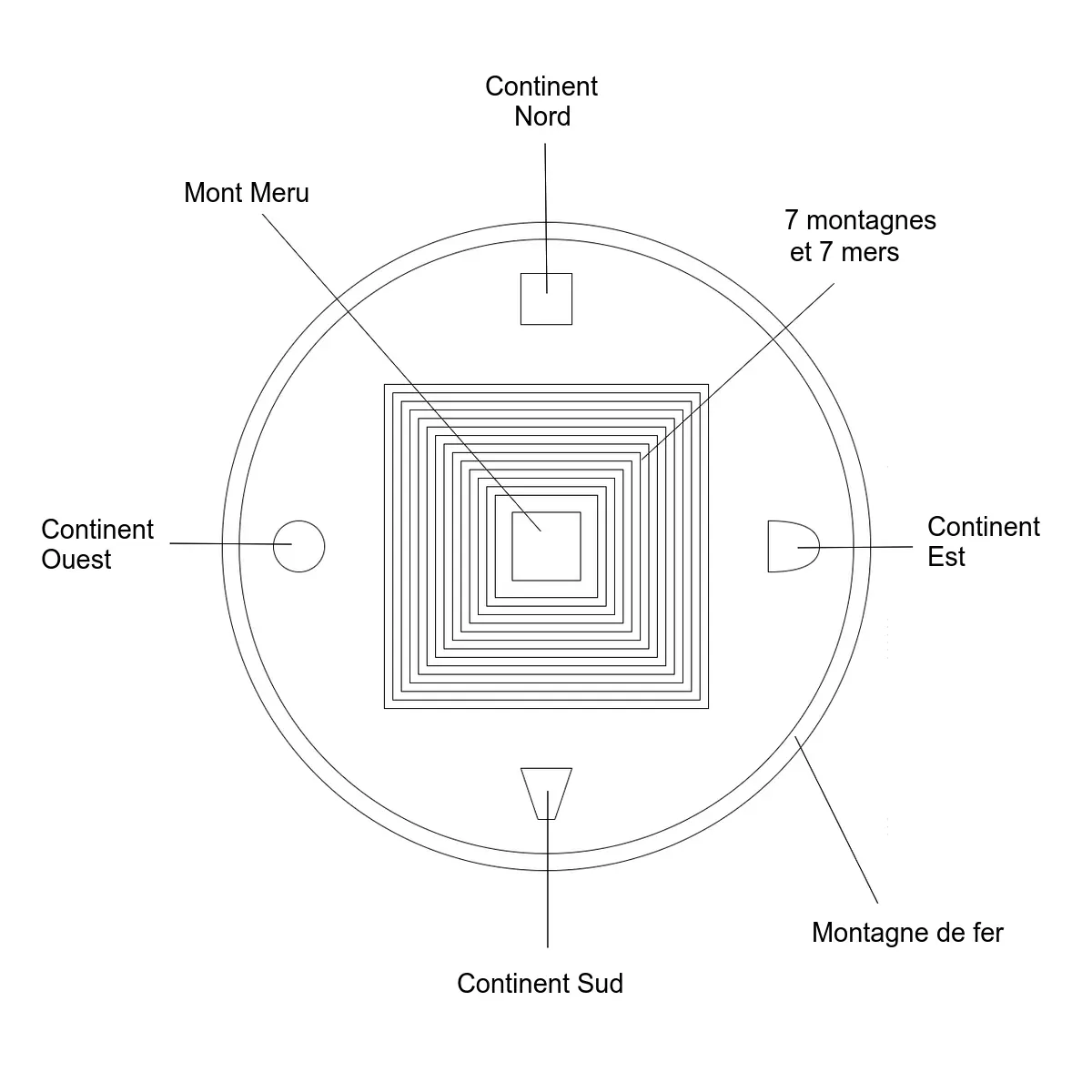 - Au centre, le mont Meru. C’est une montagne en forme de pilier dont les quatre faces sont composées d’un matériau différent : l’argent à l’est, le cristal à l’ouest, le lapis-lazuli au sud et l’or au nord.