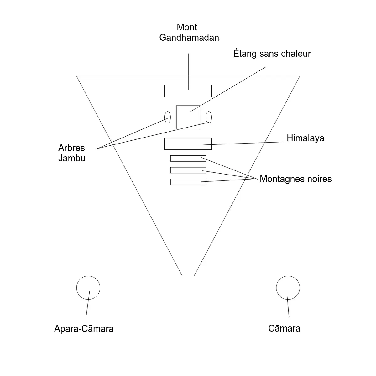 Des deux côtés de l’Étang sans chaleur se déploient les deux arbres qui ont donné leur nom au continent, les Jambu. Et tout autour s’écoulent des fleuves : le Gange, l’Indus, l’Oxus et le Sītā.