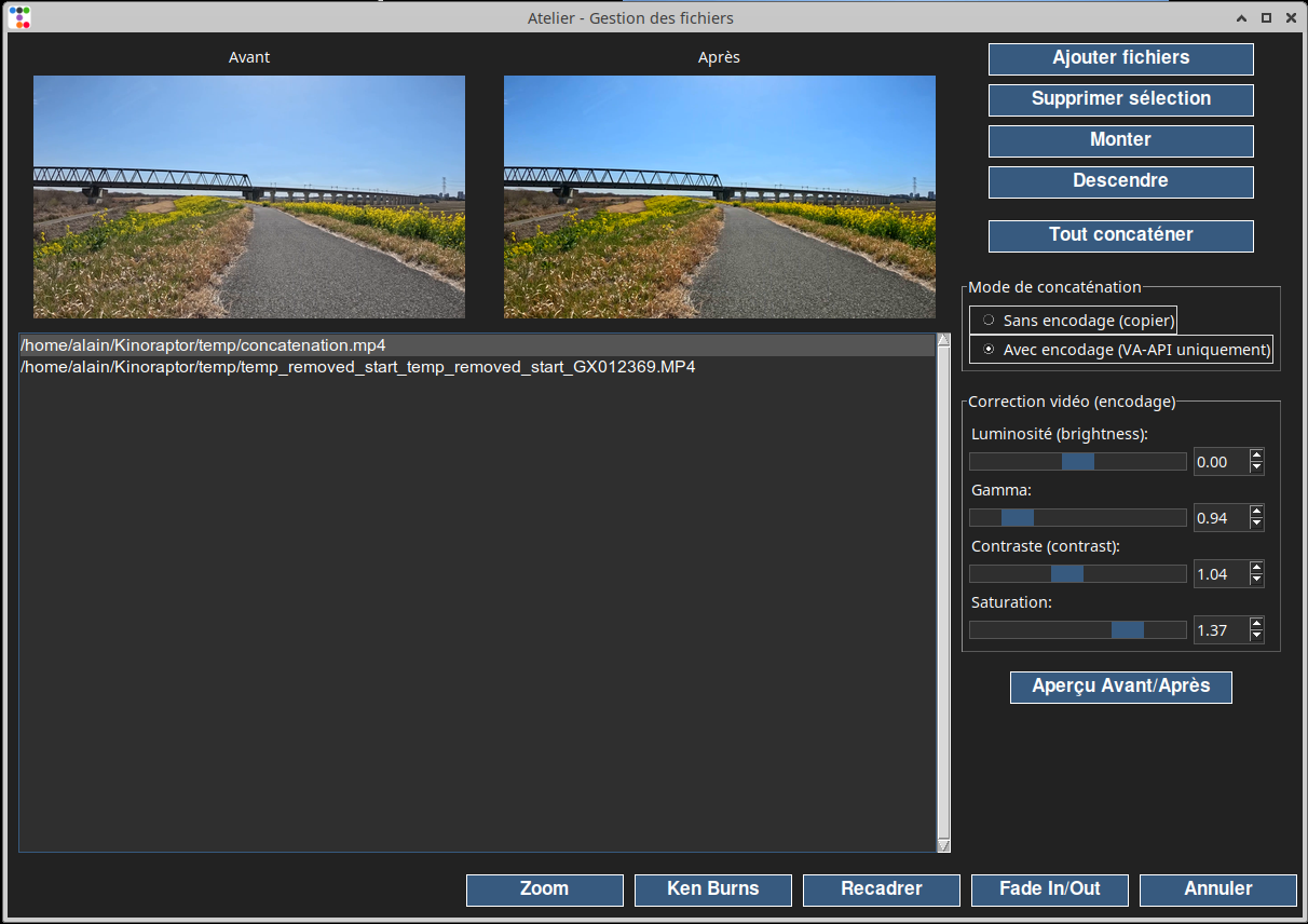 Les modifications et ajouts les plus significatifs se trouvent dans l’Atelier, qui permet de concaténer des fichiers vidéos, de corriger le rendu de l’image (luminosité, gamma, contraste et saturation), de faire un zoom entrant ou sortant sur une partie de l’image filmée par la caméra en roulant, ou de créer des effets Ken Burns sur des images fixes transformées en segments mp4 à concaténer par la suite, par exemple à la fin d’une balade.