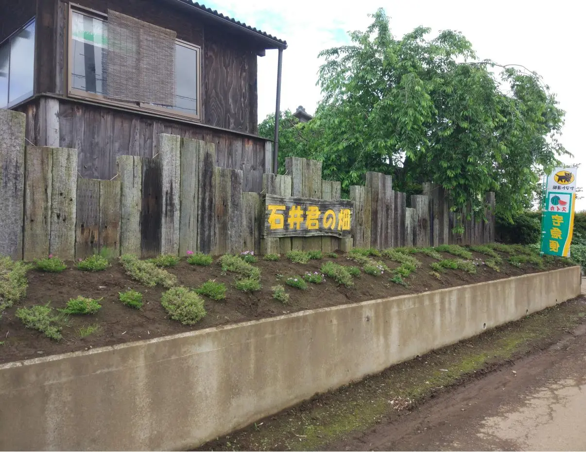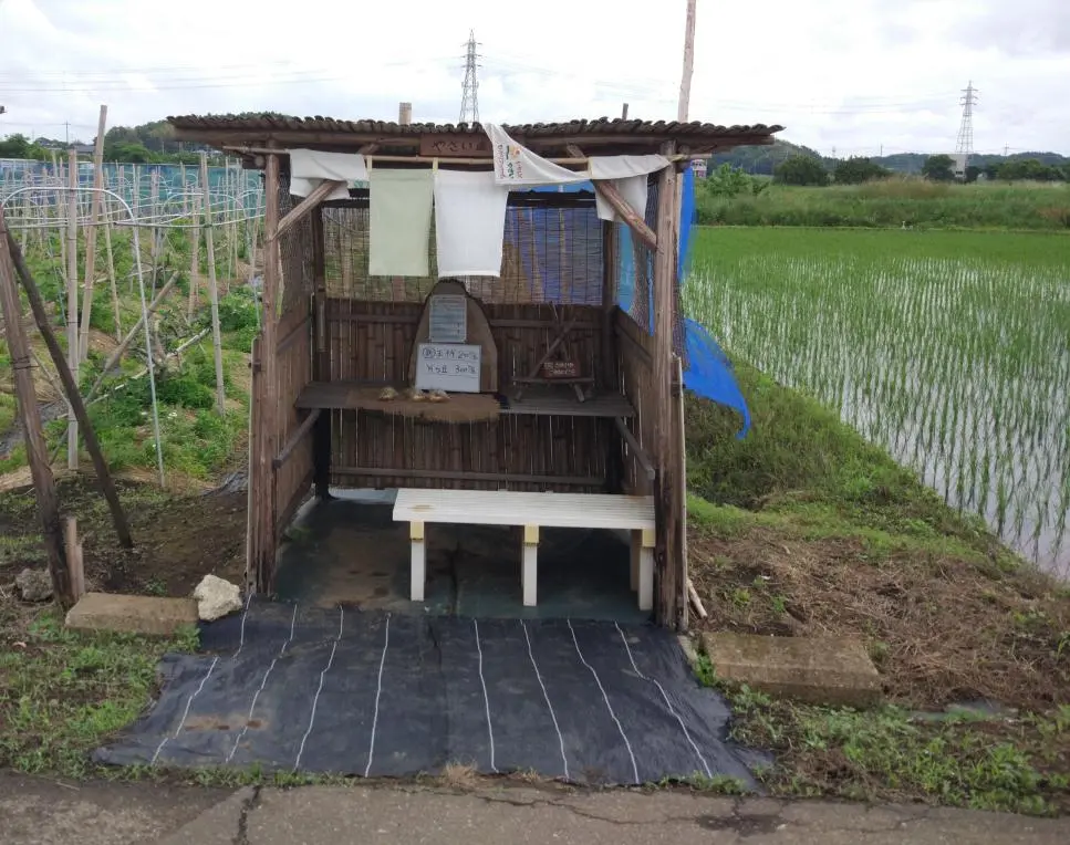 De retour sur la route, nous sommes passés devant le commerce familial d’Ishii-kun, dont l’affiche en bois disait « Le champ d’Ishii-kun ». Cette petite entreprise familiale cultive des melons depuis plus de 30 ans dans le coin, et vend le fruit de ses efforts directement aux clients. De mai à août, elle est ouverte tous les jours de 10 h à 17 h, même les jours fériés. La banderole du chat noir de Kuroneko Yamato Takkyūbin, tout au bout de la photo, indique qu’il est possible de commander et de se faire livrer les melons à domicile n’importe où au Japon.