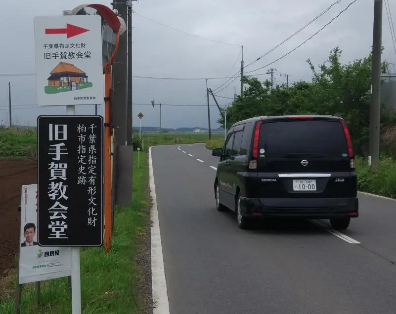 Nous étions alors passés devant l’ancienne chapelle de Teganuma (旧手賀沼教会堂) sans la prendre en photo. Nous errons et géo-tergiversons souvent dans ce coin, où le trajet GPS fait des caprices. Heureusement, ce jour-là une affiche a rapidement mis fin à notre errance, nous indiquant en gros kanjis blancs la direction à prendre.