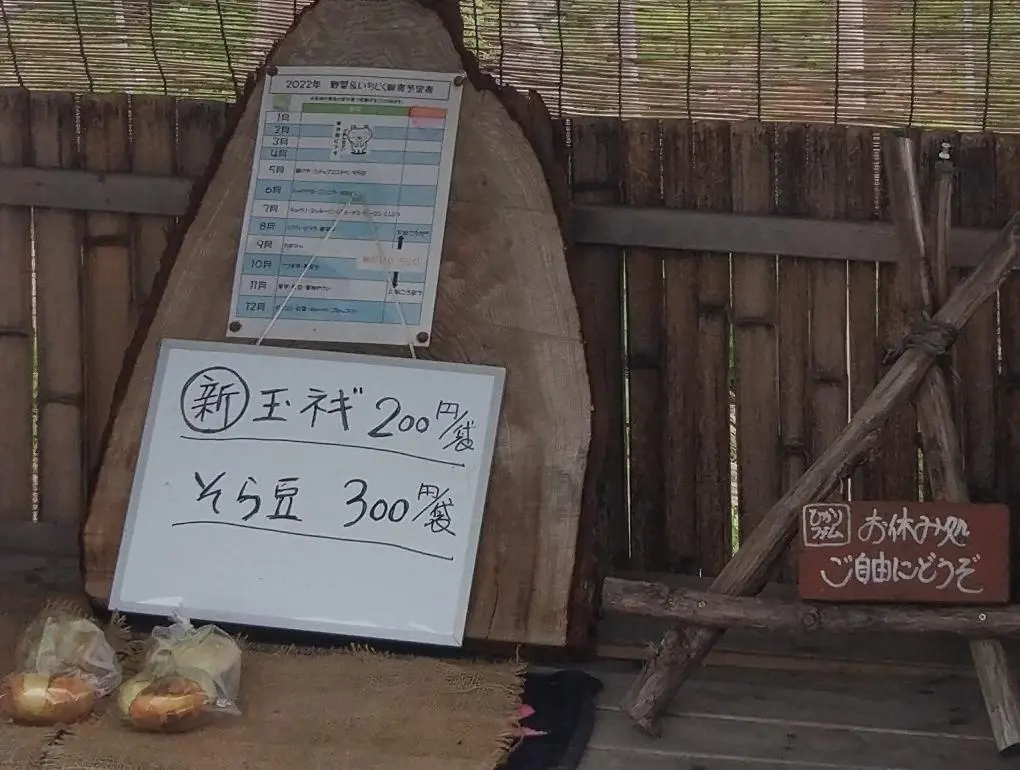 En bordure du chemin, un kiosque libre-service vendait des oignons (玉ネギ) et des fèves (そら豆)… ou ce qu’il en restait.