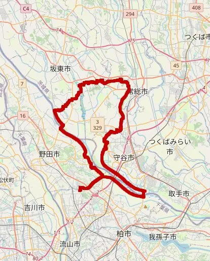 La suite s’est déroulée sans anicroches. Comme le montre la carte, j’ai bouclé la boucle jusqu’au fleuve Tone, d’où il ne restait qu’à faire un détour jusqu’au pont Shin-Ōtone (新大利根橋).