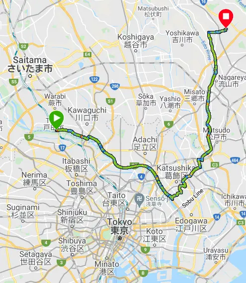Un peu plus loin, nous coupons à travers le quartier de Tora-san (Katsushika Shibamata) et continuons jusqu’à la sinueuse rivière Nakagawa (中川), qui elle-même débouche sur le fleuve Arakawa (荒川).