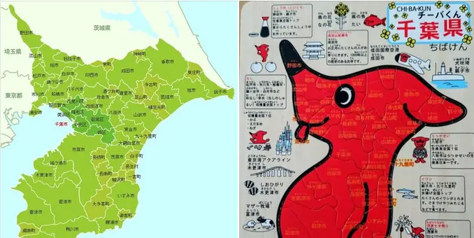 Chība-kun (チーバくん), la mascotte de la préfecture de Chiba, est un chien directement inspiré de la topographie aérienne, les limites administratives préfectorales épousant les formes du canin tel que vu à vol d’oiseau. Notre ville, Nagareyama, se trouve juste sous son museau, en plein dans les narines. La langue du canin, elle, trempe et l’abreuve dans la baie de Tokyo.