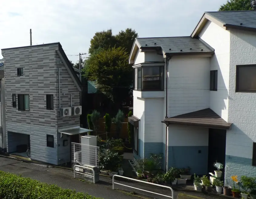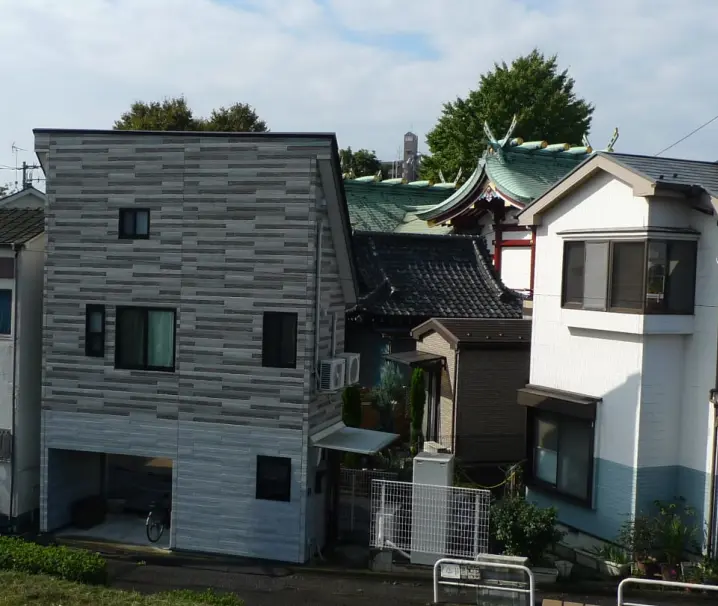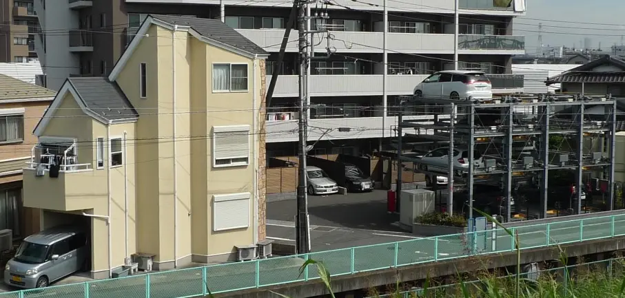 Parfois c’est une petite maison banale, toute en verticalité, qui a pour voisin un parc de stationnement étagé et squelettique.