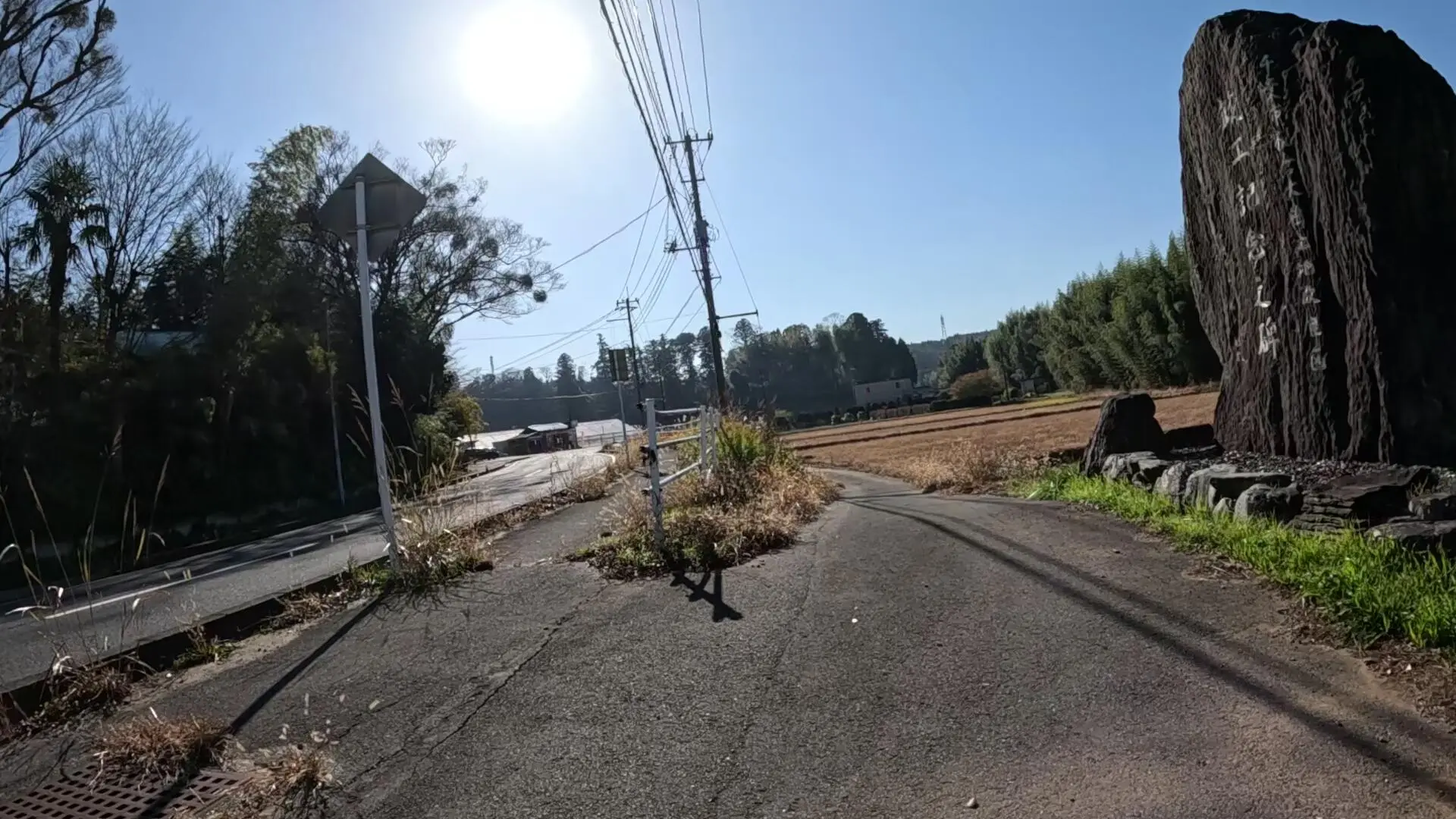 Au Japon, il n’est pas rare d’apercevoir une pierre monumentale ( 碑 ) et ses inscriptions lapidaires le long de la route, pour souligner l’aménagement d’un parc, d’un nouveau quartier, etc. Sur celle-ci, la préfecture de Chiba commémore l’achèvement des travaux ( 竣工 ) d’aménagement des terres des bourgs d’Itakura (板倉町) et d’Ōji (大椎町). (Ce n’est pas très lisible sous cet angle, alors j’ai triché en allant me placer juste devant la pierre sur Google Maps.)