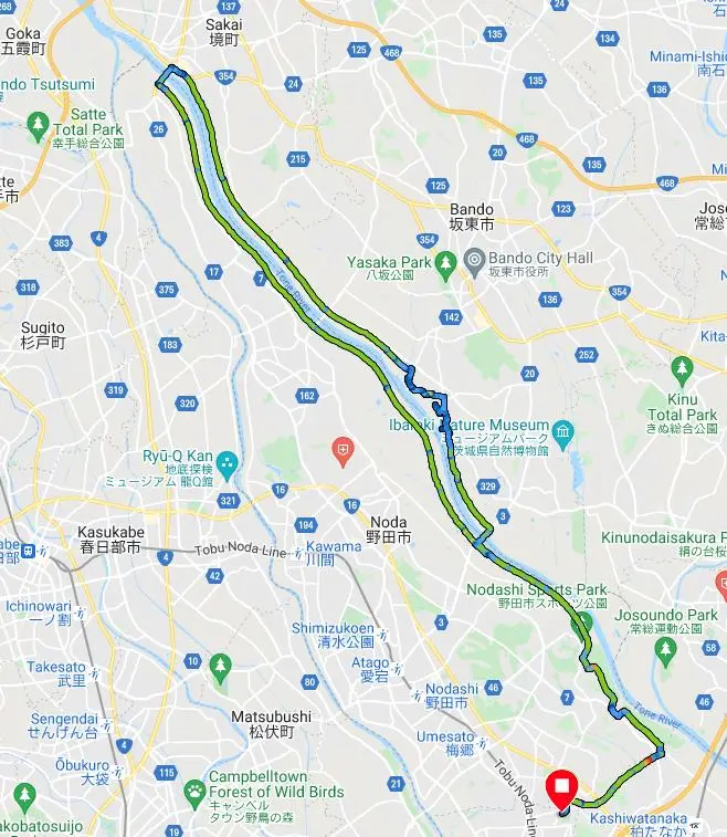 Comme la météo annonçait une fin de semaine pourrie, Béni-le-rouge a insisté pour que nous fassions une courte sortie en ce vendredi matin. Nous sommes donc allés rouler le long du fleuve Tonegawa, en direction nord-ouest, pour un aller-retour de 60 km.