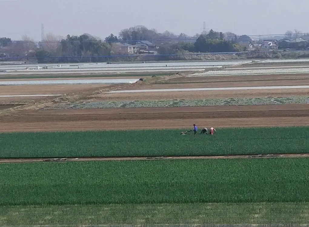 La saison rizicole n’a pas encore commencé, mais d’autres cultures, au loin, semblent atteindre la hauteur des genoux pour cette famille paysanne. De la ciboule ?