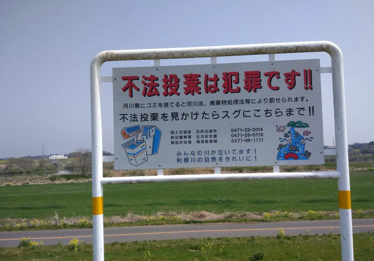 Ailleurs, une affiche précise que l’abandon des déchets (不法投棄) constitue un acte criminel (犯罪). « Notre fleuve pleure », dit aussi l’affiche, illustration à l’appui. Frigos, climatiseurs, lave-linge, vélos… je ne les prends jamais en photo, mais il n’est pas rare d’en apercevoir dans les cours d’eau ou buissons isolés et bien à l’abri des regards, abandonnés par des gens qui ne veulent pas ou ne peuvent pas payer pour les faire recycler.