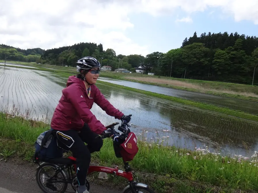 En route vers le temple Manpukuji, Salīna roule, le cœur léger, le long des rizières fraîchement repiquées.