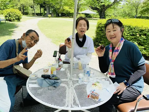 Nous voici arrivés à la dernière étape des trois premiers jours de balade. Pendant que le groupe P casse la croûte dans la cour du Tenkyōkaku (天鏡閣) avant d’aller le visiter, nous (le groupe S) faisons de même à l’ombre des pins sur la plage déserte d’Akiyama-hama (秋山浜), avec nos bentō achetés le matin près de l’auberge.