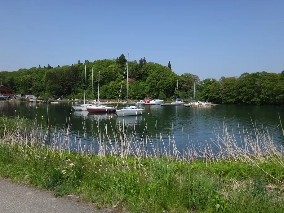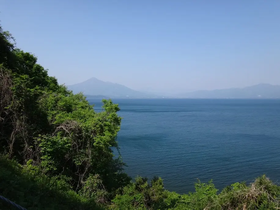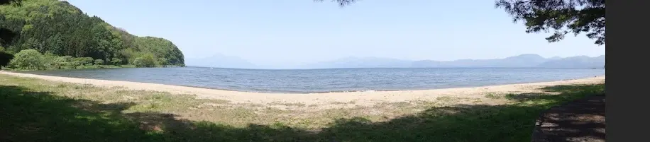 Après cette paisible marina, le trajet passe par un terrain de camping duquel on aperçoit la petite île inhabitée d’Okina-jima (翁島), dont la principale colline, pour faire ombrage au mont Bandai ( 磐梯山 ) et rigoler un peu, lui fait le coup de l’éclipse de montagne.