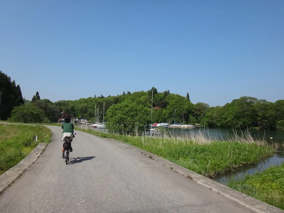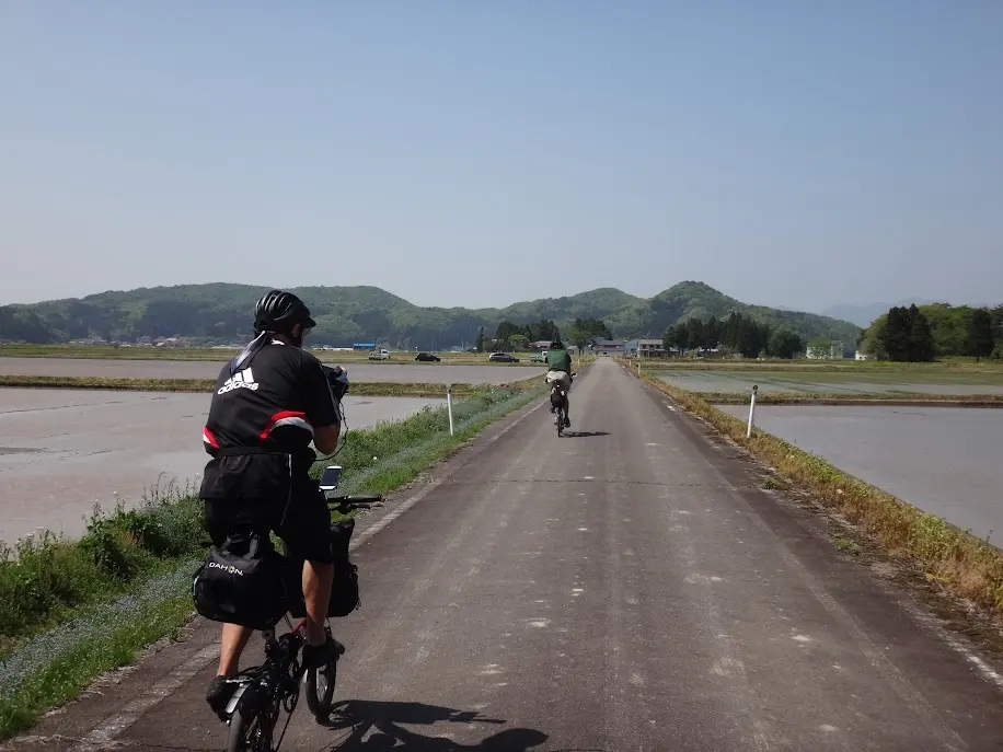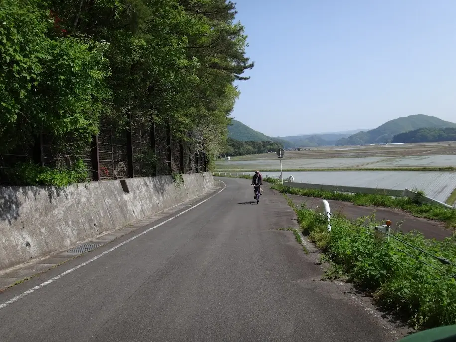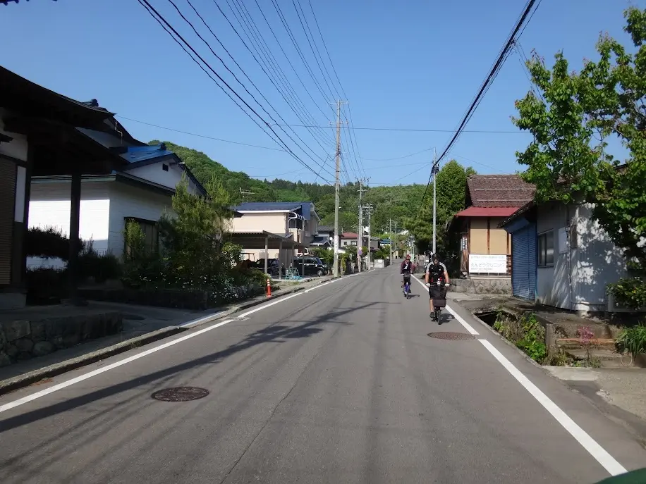 De retour sur le bitume, nous dévalons en zigzaguant les quelque 500 mètres d’altitude qui nous séparent de la ville d’Aizuwakamatsu (会津若松), dans une longue descente qui semble, à notre grande joie, ne jamais vouloir se terminer.