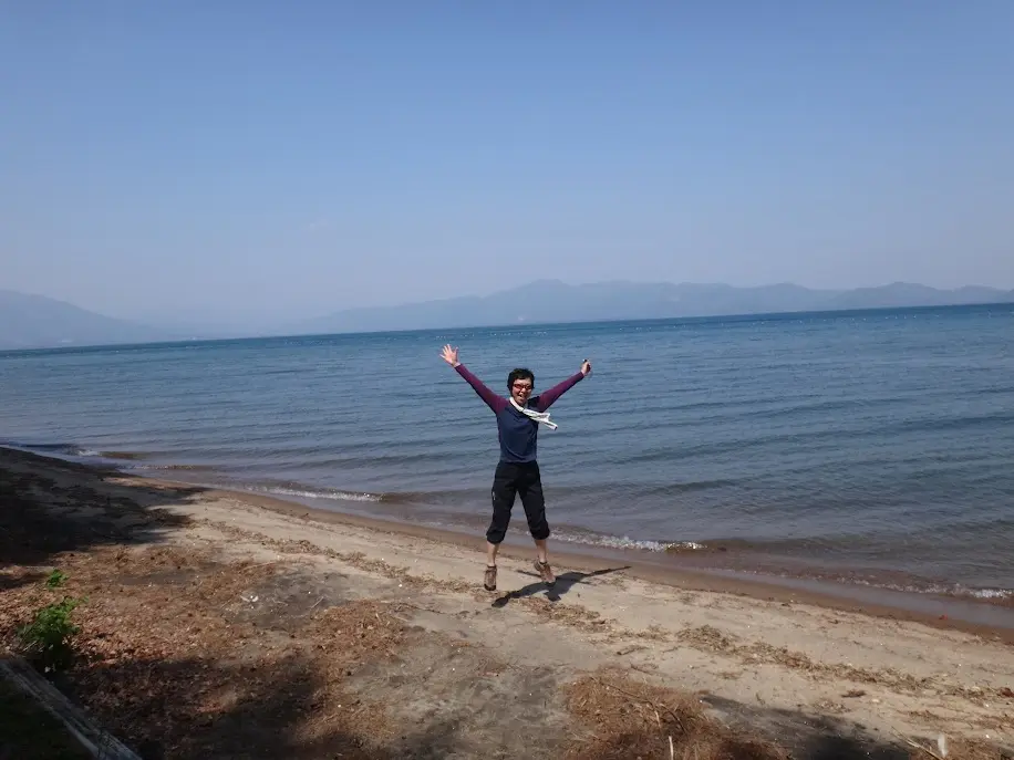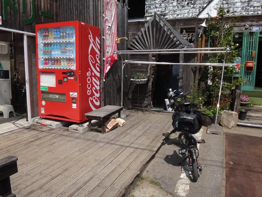Sider, dans un élan de générosité, partage ses réserves liquides avec le cycliste assoiffé, puis nous repartons, cette fois-ci vers la plage de Sakka-hama (崎川浜).