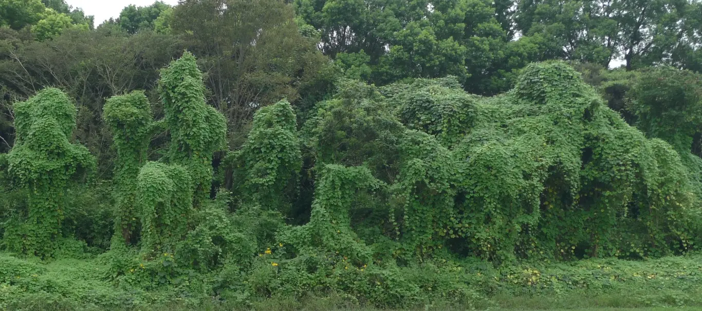 Beaucoup plus au nord-est, le long de la piste cyclable du fleuve Tone aux limites de la ville de Kashiwa, les plantes grimpantes s’amusent tout l’été à donner aux arbres, qu’elles tiennent prisonniers sous leurs fines tentacules végétales, des formes d’animaux réels ou imaginaires. Grincheux adore ce coin très peu fréquenté ; il l’appelle le petit jardin botanico-zoologique.